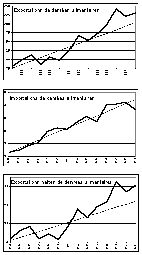 Figure 4: Échanges alimentaires, 1985-98, en millions de dollars E.-U. (en gras, les valeurs réelles; en fin, les tendances pour 1985-94 extrapolées jusqu'en 1998)