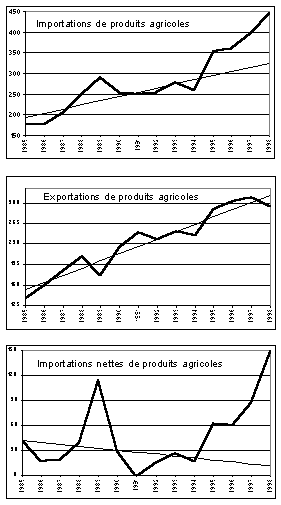 Figure 1: Echanges agricoles de 1985 à 1998, en millions de dollars E.-U. (en gras, les valeurs réelles; en fin, les tendances de 1985 à 1994, extrapolées jusqu'en 1998)