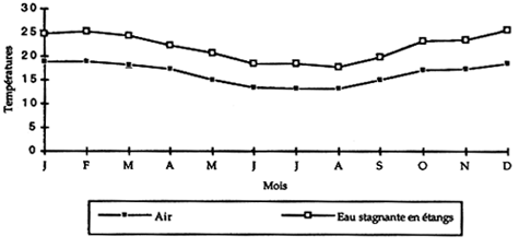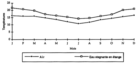 Ici, les températures moyennes de l'eau ont été relevées à la station piscicole d'Ambatofotsy/Ambatolampy, durant deux années d'observations (1989 et 1990).