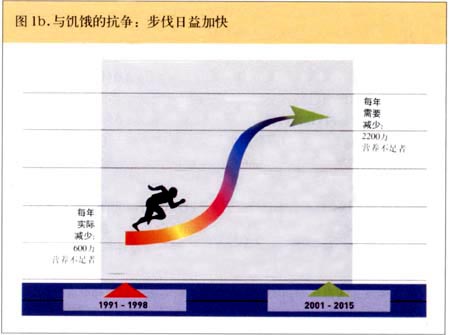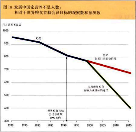 在过去十年中,发展中世界长期营养不足的总人数大约减少了4000万,但平均下降速率仍然很低;与本出版物1999年期报道的80O万相比,现在每年仅下降600万。因此,到2015年要实现既定的目标,年下降率应由每年的200O万增加到220O万。所以,差距—在实际下降数与需要下降数之间—正在扩大。如果按当前的速度发展,要花60多年时间方能实现目标。