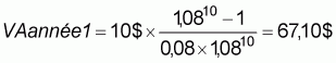 La valeur actualisée à l'année 10 des dix coûts annuels égaux (10 $ par an entre les années 1 et 10 incluses) peut être calculée à l'aide de la formule 2 du tableau A.6.1: