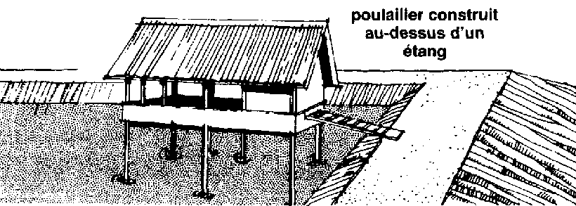 526 Vous pouvez élever des poules ou des porcs près de vos étangs. Si vous construisez des poulaillers ou des porcheries sur la digue ou au-dessus des étangs, vous pourrez balayer leurs déjections dans les étangs. Ceux-ci fourniront l'eau nécessaire aux animaux et les animaux fourniront les produits fertilisants qui viendront enrichir l'eau des étangs.