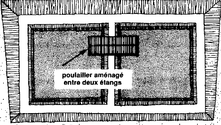 Remarque: Si vous avez construit vos étangs côte à côte, vous pouvez aménager un poulailler ou une porcherie sur le sommet du talus qui sépare les deux étangs et balayer les déjections des animaux dans les deux étangs.
