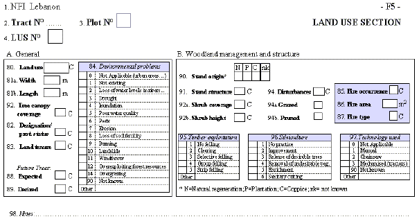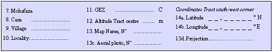 This form will be filled for each tract (1 km x 1 km). It contains general information related to the tract location and identification; information on the people living in the surrounding area of the tract and on the distance to the main infrastructures. The name list of persons involved in the inventory is also included.