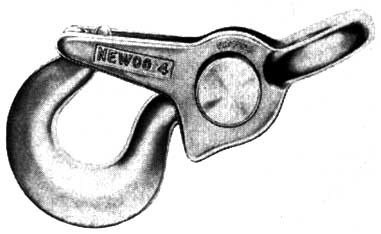GANCHO DE SEGURIDAD AUTOTRABADOR. - La nueva construcción de este gancho permite que la boca se cierre automáticamente al izar la carga. Para abrirlo es necesario quitarle el poso y apretarlo con la mano contra el esfuerzo de un resorte de compresión. La traba está hecha de una aleación de bronce manganésico, a fin de que soporte las mayores fatigas; su resistencia a la tracción es de 7.700 Kg./cm². aproximadamente.