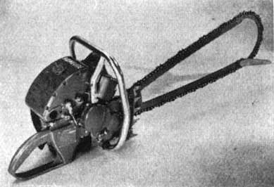 ACCESORIO DE SIERRA DE CADENA PARA DESMONTES. - Consiste este aditamento en una escarpia con mordaza de sujeción, que agregada a la sierra de cadena «Homelite» modelo 17, hace ésta muy cómoda para apear, tronzar y desramar árboles chicos y brinzales. Sirve para tronzar trozas tiradas en el suelo, evitando que la cadena se encaje en las tierra y que los maderos rueden o viren. En un instante se monta el accesorio en lugar de la cadena ordinaria y presta gran utilidad como herramienta ligera para toda clase de operaciones rápidas de limpia, por su fácil funcionamiento y maniobra expedita.