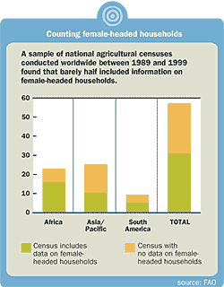 For example, nearly half of a sample of 93 national agricultural censuses conducted worldwide between 1989 and 1999 did not include information on female-headed holdings. However, census data from surveys conducted in several developing regions indicate that one out of five farms is headed by a woman. It is recognized that this figure underestimates the proportion of farms that are owned or managed by women. The legally recognized male head of household is often assumed to be the head of holding as well, even when women are responsible for the day-to-day work and decisions of running the farm.