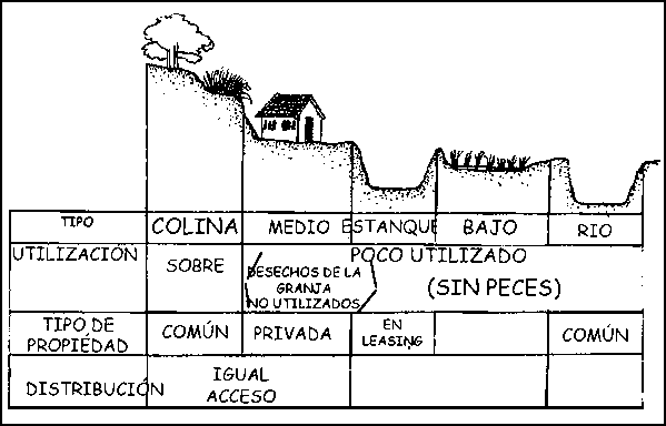 Si los agricultores expanden sus dibujos hasta incluir el área entera del pueblo, entonces podrán identificarse también los recursos de propiedad común que potencialmente pueden conectarse a las actividades de la granja como acuicultura, ganadería, etc.