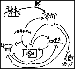 Una vez que los agricultores asimilen la idea, entonces introducir la idea de conexiones entre actividades con flechas. Estas flechas pueden ser trazadas en el suelo con un palito o marcadas con ceniza. Haciendo este ejercicio por ellos mismos, los agricultores aprenden mas rápidamente las posibilidades de integración en sus granjas.