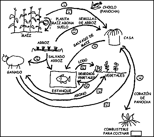 El dibujo final tendría que mostrar la gama completa de las actividades de la granja y las conexiones entre ellas. Esto transmite la idea de integración de la granja con más efecto que las palabras escritas o habladas. Un dibujo del sistema de la granja ayuda a los agricultores a precibir su propia granja como una unidad integrada de actividades inter-conectadas.