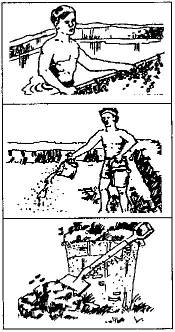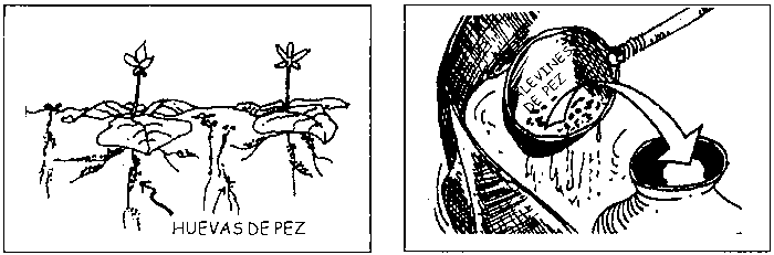 Aplicar 80-100 gr de insecticida (como Dipterex), al menos 20-24 horas antes de repoblar, para matar los insectos acuáticos que están en el estanque (día 29).