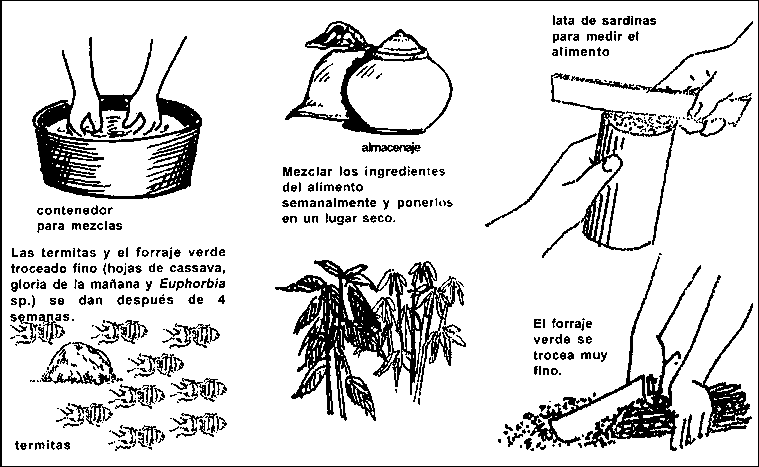 Es a menudo dificil mantener un alto nivel de alimento natural para criar alevines, de manera que se necesitan alimentos suplementarios (día 31). Se suministrará una mezcla pulverizada muy fina de torta oleaginosa (de soya, mostaza, etc), salvado de arroz o de trigo y harina de pescado a razón de 5:4:1, 200 gr divididos en varias porciones al día.