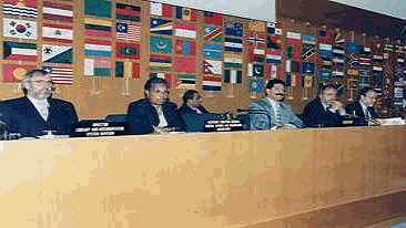 第二届农业信息管理磋商会全体会议。从左至右: Mr Anton Mangstl, 图书馆及文献系统司司长; Ms Carleen Gardner, 一般事务及新闻部助理总干事; Mr Francisco Pérez Trejo, WAICENT主任; Mr Peter Armstrong, “一个世界”国际组织干事; Mr Carlos Braga, 发展通道基金会干事。