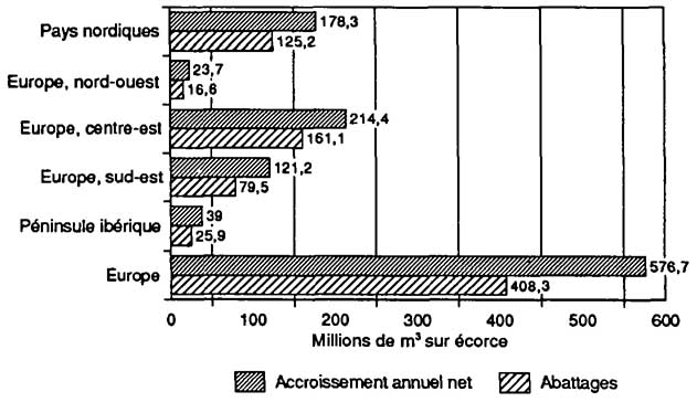 L'analyse fait une distinction entre abattages et quantités enlevées, la différence étant le volume de bois qui est coupé mais laissé dans la forêt. Le total des abattages effectués dans les pays industrialisés vers 1990 est estimé à 1,86 milliard de m3 sur écorce (voir à la figure 1 la ventilation par régions). Les statistiques des abattages (volume sur écorce) sont précieuses parce qu'en les comparant aux chiffres de l'AAN on a une indication de l'équilibre de la forêt (volume du matériel sur pied en expansion ou en diminution). Comme le montre la figure 2, le volume des abattages effectués dans les forêts exploitables d'Europe en 1990 a été sensiblement inférieur à l'AAN, ce qui signifie une nette expansion du matériel sur pied. Faute de données, il est malheureusement impossible de faire une comparaison similaire pour l'Amérique du Nord.