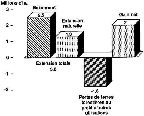 Le Canada n'ayant pas fourni de données concernant l'évolution de ses forêts dans le temps, il sera, pour la même raison, important de déterminer les tendances de ses ressources forestières. Les Etats-Unis et le Japon sont les seuls pays des zones tempérées qui aient signalé des réductions de la surface de leurs forêts et autres terres boisées. Au Japon, il y a eu une petite perte nette de 48000 ha entre 1980 et 1990; aux Etats-Unis, la perte nette s'est élevée à près de 3,2 millions d'ha entre 1977 et 1987.