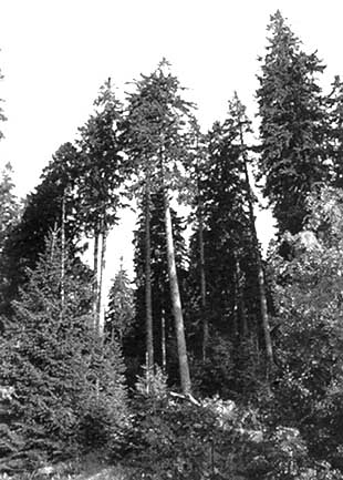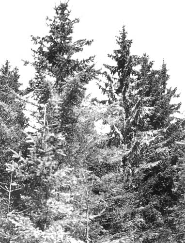 La comparaison de photographies récentes de Waldsterben (par exemple, Schütt, 1984; Bauer, 1985) avec d'anciennes photographies de peuplements forestiers tirées de revues scientifiques, d'albums de photographies ou de cartes postales, montre que les arbres présentant un houppier transparent étaient aussi courants autrefois. Une évaluation d'environ 2000 épicéas clairement reconnaissables sur des cartes postales datant d'avant 1925 et de 1975 à 1985 (Schweingruber, 1989) a montré que de 16 à 41 pour cent et de 16 à 21 pour cent des arbres présentaient de nets déficits de feuillage équivalant aux catégories 2 à 3 pour la première et pour la deuxième période, respectivement. Ces chiffres sont pratiquement identiques à ceux des dernières enquêtes (WSL, 1992).