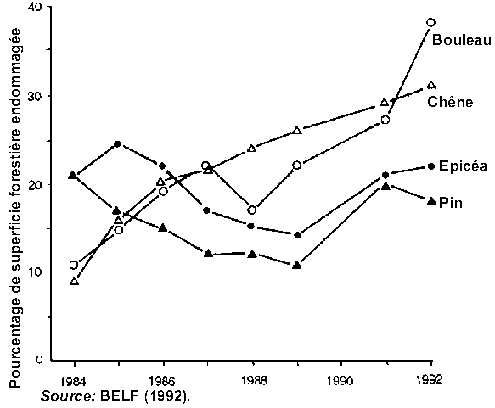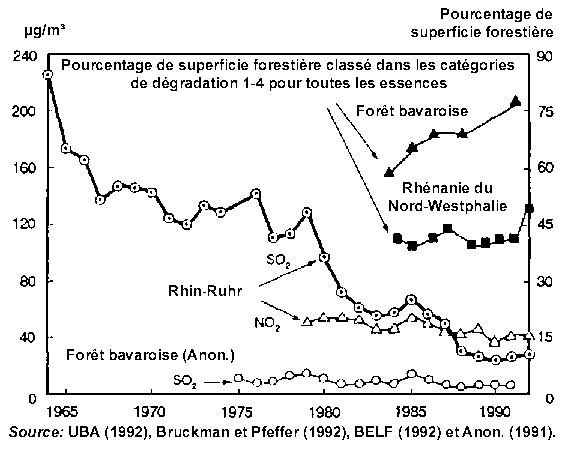 Du point de vue écologique, la baisse des concentrations de SO2 dans la Ruhr et d'autres centres d'émission de SO2 depuis les années 60 a provoqué le rétablissement rapide des conifères et la réapparition des épicéas et des lichens dans des régions où ils avaient disparu depuis près de 100 ans (Kandler, 1988b). Ces phénomènes montrent que le SO2 était seul responsable des dégâts de pollution classiques; les autres produits polluants jouaient, tout au plus, un rôle secondaire. Ni le développement ni les niveaux de la nouvelle dégradation des forêts sur tout le territoire de l'Allemagne occidentale, dans les diverses régions ou par essence d'arbre, ne suivent l'évolution des enregistrements directs des concentrations de SO2, NO2 et d'ozone effectués par les stations de surveillance permanente. Ainsi, il n'est guère probable que la pollution de l'air soit la cause ou même un des facteurs importants du syndrome de nouvelle dégradation des forêts.