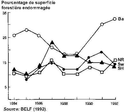 L'évolution de la dégradation annuelle enregistrée varie selon chacune des quatre principales essences d'arbres (figure 2) ainsi que d'une région à l'autre (figure 3). L'évaluation par essence montre que la légère hausse du niveau de dégradation générale observée au début des années 90 (figure 1) est exclusivement due à la nette aggravation subie par les deux essences de feuillus; au début des années 90, les deux essences de conifères présentaient au contraire des niveaux de dégradation légèrement inférieurs à ceux du début des années 80. En fait, les deux feuillus ont dépassé les deux conifères en 1987 et présentent maintenant des niveaux de dégradation beaucoup plus élevés qu'eux. Un tel renversement des proportions de dégradation chez les feuillus et les conifères n'est pas compatible avec l'hypothèse du Waldsterben fondée sur la pression cumulative qu'exerceraient sur l'écosystème les produits polluants de l'air et leur dépôt; en effet, la sensibilité des arbres aux facteurs de stress de l'environnement varie selon l'essence, et les réactions devraient rester inchangées, à moins que l'intensité ou le type des facteurs de stress ne varie considérablement.