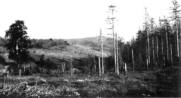 La dégradation classique à grande échelle des forêts par les fumées (SO2) est devenue un phénomène courant dans les zones industrielles d'Europe centrale dès les débuts de l'industrialisation au 19e siècle. Ce type de dégradation persiste aujourd'hui dans les anciens pays du bloc oriental, par exemple dans les monts Métallifères situés à la frontière entre l'Allemagne orientale et la République tchèque. Les deux grandes zones d'extraction de lignite ouvertes au début des années 50, la vallée de l'Eger et Bitterfeld, sont les principales sources de SO2, qui ont provoqué une nette dégradation des forêts sur une zone de plusieurs milliers de km2 de chaque côté des monts Métallifères et qui ont affecté également les montagnes voisines du Harz et du Fichtel en Allemagne occidentale (Wentzel, 1982). Cependant, les conifères ne sont vraiment détruits que sur la crête des monts Métallifères à une altitude d'environ 900 m où l'effet nuisible du SO2 est nettement renforcé par les vents violents (Liebold, 1988).
