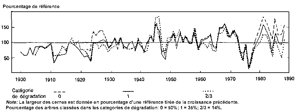 L'analyse des cernes est un bon moyen de retracer la croissance d'un arbre sur de longues périodes. Des études à grande échelle de multiples auteurs portant sur toutes les principales essences de différentes régions d'Europe centrale ont fait apparaître une profonde marque d'arrêt de croissance au milieu des années 70, qui coïncide avec une série d'années de sécheresse, mais aucun ralentissement général et persistant dans l'augmentation du diamètre au cours des dernières décennies. Les arbres des catégories de dégradation 1, 2 et 3 présentent des taux de croissance différents, mais l'écart par rapport à la moyenne ne dépasse généralement pas la gamme habituelle de variations au sein de populations importantes, qui est due à la concurrence et aux conditions différentes de terrain dans le peuplement, ou à des dégâts mécaniques individuels, des infestations et des maladies infectieuses. Un exemple typique concernant l'épicéa de Norvège est présenté à la figure 5.