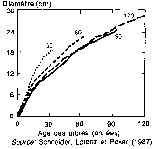 On remarque également une amélioration de la croissance, ces dernières décennies, si l'on compare l'augmentation du diamètre (figure 6 et Schneider, Lorenz et Poker, 1987) ou de la hauteur (Keller, 1992) de différentes générations d'arbres dans les peuplements d'épicéas se trouvant dans des conditions de terrain identiques: pour les épicéas, les peuplements âgés dé 30 à 60 ans ont poussé plus rapidement que ne l'avaient fait ceux de 90 à 120 ans au même âge.