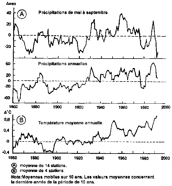 La température, les précipitations (figure 7) et la concentration de CO2 contribuent probablement à l'amélioration de la croissance, puisqu'elles agissent en synergie et que leur augmentation considérable coïncide approximativement avec l'accélération de la croissance des forêts au milieu du siècle alors que le dégage ment d'azote provenant de la circulation des véhicules était encore à un niveau très bas. Cependant, aucune donnée sur les corrélations qui corroboreraient ces idées n'est encore disponible.