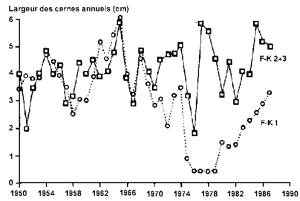· Les chronologies des cernes annuels et les inventaires forestiers ne révèlent aucune trace d'arrêt de croissance, mais plutôt une amélioration de la croissance dans les années 80.