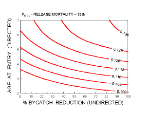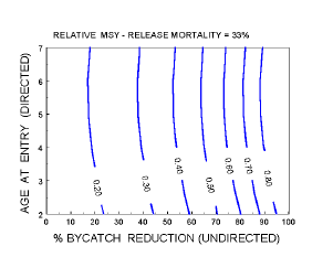 Recruitment into the directed fishery was considered to be knife-edge (i.e. fish at a given age were assumed to be either entirely available or entirely unavailable to the fishery). Ages at entry into the directed fishery examined, ranged from two to seven years. Release mortalities from the directed fishery examined were 0%, 20%, and 33%. MSY was calculated as a function of the minimum age of recruitment into the directed fishery, undirected fishery bycatch, and directed fishery release mortality. MSY was calculated by first calculating the yield-per-recruit for a given fishing mortality and a stable age distribution. Eggs-per-recruit was subsequently calculated from the resulting exploited age distribution and the fecundity function. Applying the stock-recruitment function to the eggs-per-recruit the calculation was then solved for the total number of eggs, recruits, and yield. MSY was calculated by interactively searching for the directed fishing mortality that resulted in the largest equilibrium catch in weight (FMSY) to the directed fishery. The spawning potential ratio (SPR), the ratio of lifetime reproductive potential of the average female in the fished stock (Pfished) to that in an unfished stock (Punfished), was estimated as described in Goodyear (1993), such that SPR = Pfished/Punfished. All estimates of MSY, FMSY, and SPR were made for equilibrium conditions. Consequently, all isopleths in the figures correspond to fishing at MSY.
