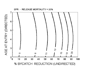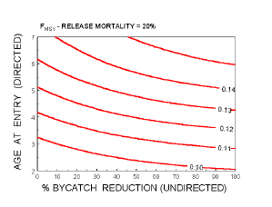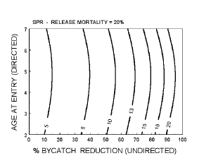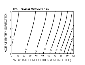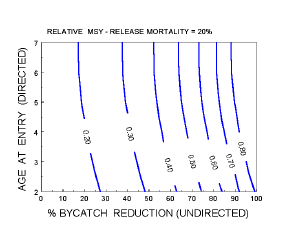 The nearly vertical relationship between percent bycatch reduction and age at entry indicate that reducing bycatch has a much greater effect on increasing SPR than increasing the age at entry into the directed fishery (Fig. 1d). For a given level of bycatch reduction, increasing age-at entry into the directed fishery decreased the SPR. At first this may seem counter intuitive. However, the relationship between bycatch reduction and age at entry (Fig. 1c) shows that increasing age at entry into the directed fishery must be accompanied by an increase in fishing mortality in order to maintain the yield at MSY. This increase in fishing mortality then results in the decrease in SPR as is shown in Fig. 1d. Although the SPR decreases with increasing age at entry to the directed fishery, an increase in yield is also realised. This is shown in Figs. 1a and 1b as the relative MSY increases with increased age at entry into the directed fishery for a given level of bycatch reduction.