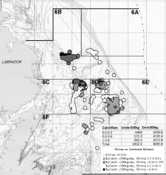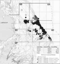 The example presented here, extracted from the greater analysis that covered all shrimp management areas (Fig. 1) over 8 years, is used to illustrate the results of this greater body of work. Relatively high levels of bycatch were experienced in 1988 in the southern shrimp area 6 (Northeast Newfoundland Shelf), typical of the years prior the early 1990's (Fig. 2). Over nearly all of the area 6 grounds in 1988, the combined bycatch of commercial species exceeded 300 kg per day, a rate deemed excessive by industry and DFO. Less than 5% of the area fished yielded good (> 0.6 t per hour) shrimp catches in combination with low bycatch rates.