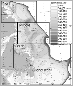 Analysis of spatial patterns of the distribution and density of cod showed that the stock had undergone several major changes during the 1980's and 1990's (Kulka 1998b). During the autumn (research survey data), winter (fishery observer data) and spring (acoustic research data) in the 1980's, cod were found to be aggregated in four areas: North, along the Labrador coast from 51º00'N to the shelf edge north of 54º30'N; Middle, along the shelf edge between 51º30'N and 53º00'N; South, along the north-east slope of the Grand Bank to 50º30'N and; Grand Bank, on the top of the northern portion of the bank. (Kulka 1998a).