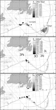 | Figure 6. Observed location of directed fishing effort on skate for the period 1993-1998, (a) otter trawl, (b) gillnet and (c) longline. Darker shades of gray depict areas with higher catch rates. | Figure 7. High-density areas of thorny skate (weight (kg) per tow) determined from research vessel survey data using Campelen trawls from 1995 to 1997. Areas shown are of sufficient density to support commercial fishing. Darker shades of gray depict higher densities of skate. Overlaid crosses depict commercial fishing locations. |