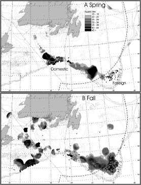 Northern cod (Gadus morhua), occupying the Northeast Newfoundland and Labrador Shelf (Fig. 4) underwent distributional changes starting in the late 1970's. These changes were concurrent with substantial population reductions culminating in a commercial collapse of the stock in the early 1990's (Kulka 1998a, Lilly et al. 1998). This study illustrates distributional changes in northern cod distribution in the years leading up to the collapse using detailed geo-referenced data from observer, research trawl and acoustic survey sources. Observers were deployed on 100% of vessels in the winter offshore fishery after 1986, allowing a detailed description of this fishery to be recorded.