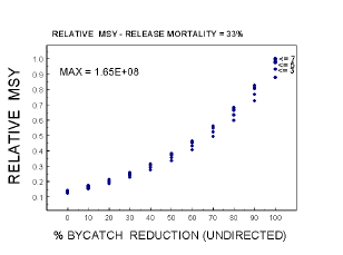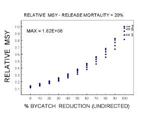 In order to manage the directed fishery for red snapper effectively it is necessary to monitor and manage the undirected fishery (i.e. the shrimp fishery bycatch). This is because MSY is not a unique number of pounds or number of fish, but is dependent upon, amongst other things, a value for bycatch mortality for the undirected fishery as well as the age at entry for the directed fishery. If regulations are put into place that change bycatch mortality, or the selectivity pattern of the directed gear, then the calculations of MSY will change as well.