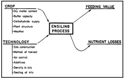 The major factors influencing silage fermentation are illustrated in Figure 1. The successful manipulation of the factors contributed by the crop and the technology of ensiling have significant effects on the losses sustained in the silo and on the feeding value of the resulting silage.