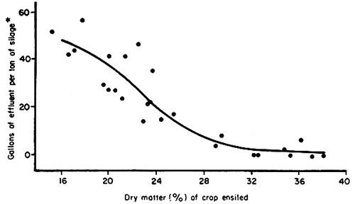 For these reasons, silages should be made from crops with at least 25 percent dry matter. Conversely, silages with insufficient moisture have an adverse influence on fermentation with the result that the optimum range in dry matter is between 25 and 35 percent. Forages should never be permitted to reach optimum dry-matter levels to the detriment of their nutritive value. It is preferable to correct for moisture by adding high dry-matter roughages than to harvest the forage at a late stage of maturity. A major problem in ensiling high moisture forage is the effluent, or “run-off” produced in the process. The data in Figure 2, compiled by Murdock (1954), show that seepage was greatly reduced at more than 25 percent dry matter and almost eliminated at 30 percent dry matter. The large variations at each level of moisture were due to differences in crops and amount of material ensiled. Large silos with heavy compaction produce more effluent than small silos. Proper disposal of inffluent should be considered in planning for silo construction and location.