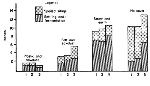 A major failure in silage technology, particularly in warm, humid areas, arises from lack of protection of the silage mass after ensiling. Owen and Miles (1956) in Mississippi demonstrated the need for and effectiveness of silo covers. Their data in Figure 3 is of particular interest, since it illustrates losses under warm, humid conditions. The use of straw and earth was of little value, since it permitted rain water to permeate the silo. The felt and sawdust cover was also found to be inadequate. A heavy plastic, covered with sawdust, reduced spoilage by 88 percent, and was a very economical use of both labour and money in the silage-making process.