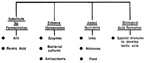 Silage additives are usually included as a part of the technology of silage making. However, due to the current economic value of additives and the wide range of their use, an understanding of the mode of action or classification of additives is essential. The four basic forms are illustrated in Figure 4. Traditionally, silage additives have been considered as useful tools for silage-making in cool, wet climates where legumes are part of the silage mixture. In recent years, new emphasis has been placed on their use in warm, humid areas and with crops other than legumes. In part, this change in emphasis comes from the realization that forages grown under high temperatures must be harvested at earlier stages of maturity if they are to be of sufficient quality to result in acceptable levels of animal performance. Research in Australia by Minson and McLeod (1970) showed that dry-matter digestibility was negatively correlated with mean temperature (r = -0.76) and rate of evaporation (r = -0.64). Thus, to obtain highly digestible forages in warm climates, forages must be harvested while they are high in moisture.