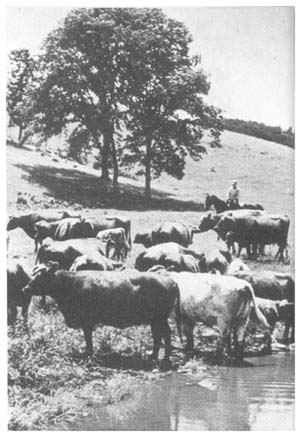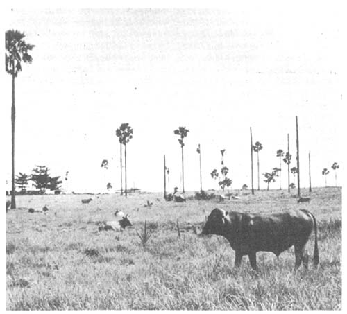 In this central African country the problem is how to avoid overgrazing, which precludes any improvement of the cattle industry. These Ankole cows start their productive life at about four years of age, and barely produce one calf every two years. A specialized fattening industry in areas of the country where better pastures exist would provide at least part of the solution.