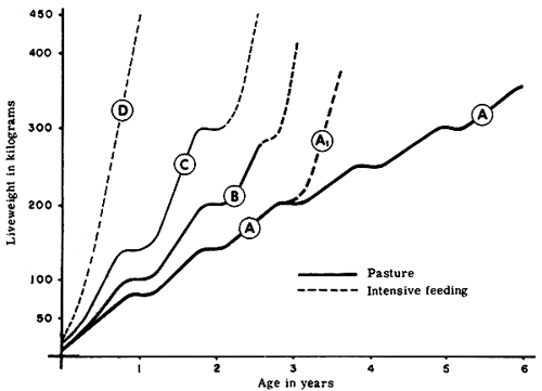 In traditional extensive systems where animals are killed at 6-7 years of age at a liveweight of 400 kg, as much as 85 percent of the feed is used for maintenance. In slightly more intensive systems, combining a less primitive breeding and rearing phase with an intensive feedlot period (say, for 150 days achieving a final weight of about 400 kg at 36 months), two thirds of the feed is used for maintenance and one third for growth.