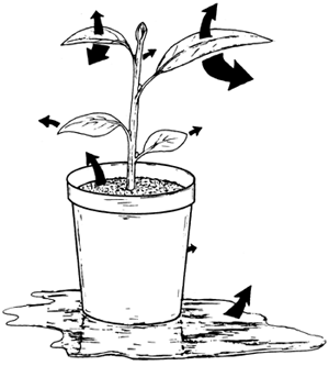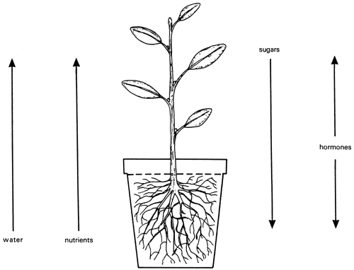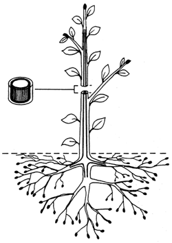 When a fine, absorbing root is in close contact with small, moist soil particles, it is easy for water to pass through the thin walls of its surface cells. Because of the dissolved substances they contain, water is then taken up strongly through their cell membranes (C 10). Most of it moves from cell to cell into the water-conducting ‘pipes’ of the root, and then into the shoot system.