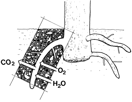 In some tropical trees part of the root systems are above-ground, for example as stilt roots or as ‘breathing’ roots, found especially when the soil is waterlogged.