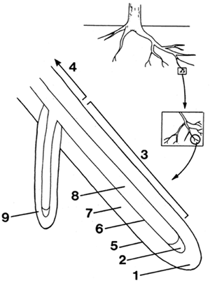 | Section through a young root. 1 — root cap. 2 — cells dividing. 3 — cells dividing, elongating and becoming specialised. 4 — zone no longer elongating. 5 — surface cells. 6 — boundary cells. 7 — storage cells. 8 — conducting cells. 9 — branch root. | ![]() |