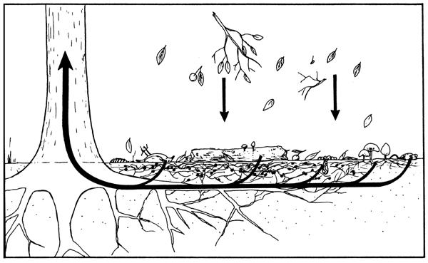 Under trees, the litter is usually by far the most important. Most nutrients are very efficiently recycled in natural woodland ecosystems, so that they are used over and over again, with only very small losses in run-off and leaching (D 13).