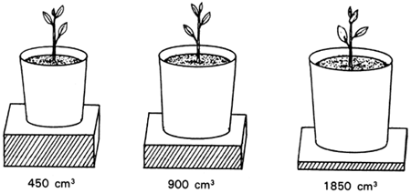 If, for instance, you chose tapered pots where the diameters at the level of the soil at the top were 9.5, 12.25 and 15.5 cm, this would give soil volumes for the root systems of about 450, 900 and 1850 cubic centimetres. The medium-sized pots would hold about twice the soil of the small ones; and similarly the large containers would have about double the contents of the medium-sized pots.