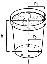 Example (b): if the diameter is 14 cm and the height 16.5 cm, the soil volume will be about 2500 cm3. (Larger than this, cylindrical pots are very heavy to use.)