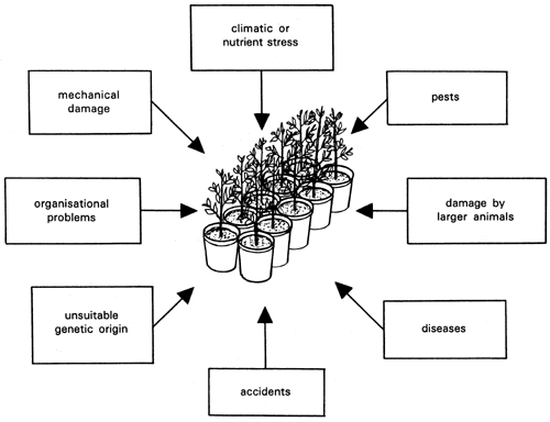 | trees dying | Unsuitable species or provenance? Poor clone? Unfavourable nursery environment? Insufficient care of young trees? Virus disease? Serious pest? | C 5 C 5 C 3, 4 C 40, 50, 52 C 45, 53 C 45, 53 | |