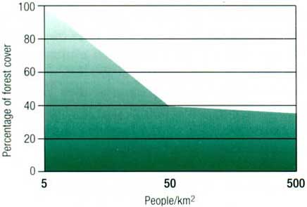On the other hand, farmers in the Kissidougou area of Guinea developed a symbiotic rainforest-livestock system. Livestock here are used to clear up undergrowth in the forest, which could then be used for fuelwood and shade for the perennial crops. The population density increased over the last two decades from 10 to 60 persons/km2, but here a positive relationship emerged between population density and forest cover. Source: