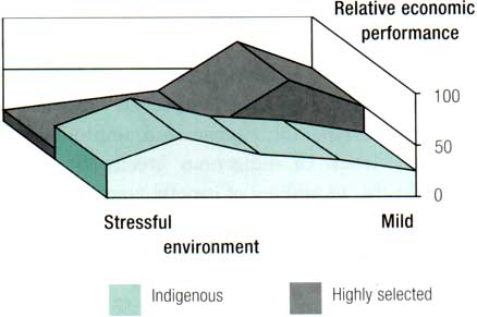 Figure 5.3 demonstrates how different genotypes respond to different types of environments. By removing environmental stresses the genotype of highly selected breeds can more fully express itself. By viewing breeds in the context of composite productivity, it becomes much more apparent how indigenous breeds (or those breeds which have been selected for a different set of characteristics) can have the potential for higher levels of productivity.