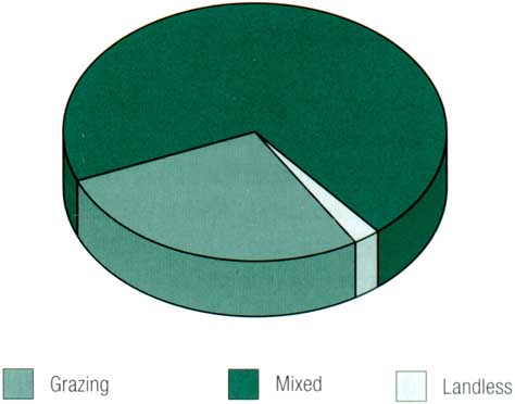 Low productivity and poor feed quality are characteristic for most of the land-based production systems in arid regions, and to an even greater degree in the humid tropics and sub-tropics, where emissions per unit of product are therefore comparatively high. Grazing and mixed systems in the tropics and subtropics are thus the main contributors to high methane emission levels. Generally, temperate and highland zones have the best quality grazing and other forage resources for ruminants, and therefore lower emission levels. In irrigated areas, fodder is usually of better quality resulting in lower emissions. Annually, livestock produce a total of 86.6 million tons methane of which more than 80 percent (74.5 million tons) comes from digestive fermentation.